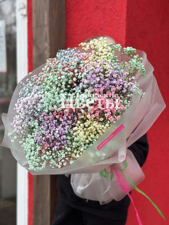 Букет "Радужный" (15 веток) 4700 Оформить заказ Размер: высота ~45 см диаметр ~40 см Состав: гипсофила mix, 15 шт. пленка матовая (Корея) лента атласная Размер: высота ~45 см диаметр ~40 см Состав: гипсофила mix, 15 шт. пленка матовая (Корея) лента атласная С цветами можно подарить:Конфеты "Rafaello"800 ₽ Мишка "Веня"1 400 ₽ 5 разноцветных шаров1 350 ₽ Конфеты "Ferrero Rocher"1 200 ₽
