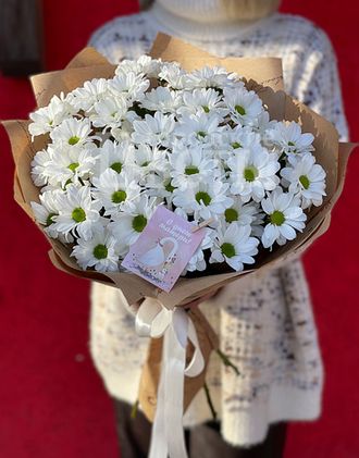Букет из ромашковых хризантем в крафте (7 шт) 3250 Оформить заказ Размер: высота ~65 см Состав: хризантемы кустовые Bacardi, 7 шт. крафт-бумага лента атласная открытка Размер: высота ~65 см Состав: хризантемы кустовые Bacardi, 7 шт. крафт-бумага лента атласная открытка С цветами можно подарить:Конфеты "Rafaello"800 ₽ Мишка "Томми"1 400 ₽ Конфеты "Ferrero Rocher"1 200 ₽ 5 красных шаров "Сердце"1 500 ₽